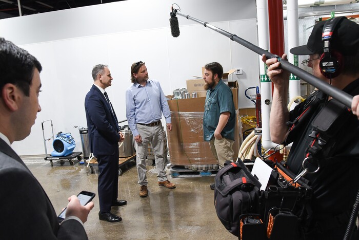(Francisco Kjolseth | The Salt Lake Tribune) With a film crew in tow, Christopher Pilkerton, left, acting head of the U.S. Small Business Administration and advocate for the nationÕs 30 million small businesses gets a tour of Level Crossing Brewing Company in South Salt Lake from owner Mark Medura, center, and head brewer Chris Detrick on Thursday, May 9, 2019. Pilkerton is visiting several small businesses in Utah to celebrate National Small Business Week.