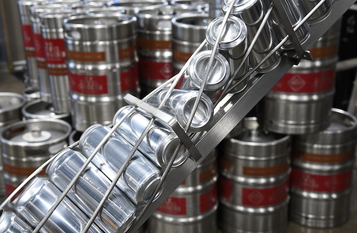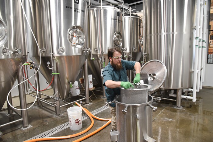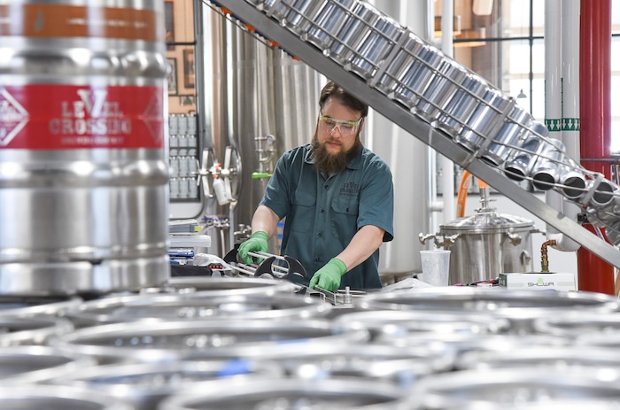 (Francisco Kjolseth | The Salt Lake Tribune) Head brewer Chris Detrick for Level Crossing Brewing Company gets ready for their first canning run at the small business in South Salt Lake on Thursday, May 9, 2019. Christopher Pilkerton, acting head of the U.S. Small Business Administration and advocate for the nationÕs 30 million small businesses toured the brewery in celebration of National Small Business Week in Utah.