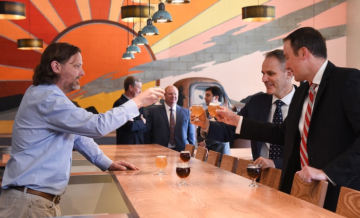 (Francisco Kjolseth | The Salt Lake Tribune) Mark Medura, left, owner of Level Crossing Brewing Company in South Salt Lake, shows off his beer selections to Christopher Pilkerton, acting head of the U.S. Small Business Administration, second from right, and regional administrator Dan Nordberg during a tour of the brewery on Thursday, May 9, 2019. Pilkerton and advocate for the nationÕs 30 million small businesses was in Utah to celebrate National Small Business Week.