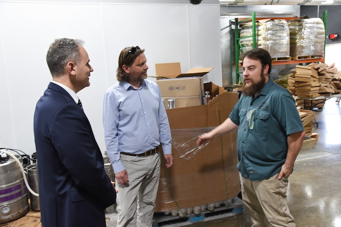 (Francisco Kjolseth | The Salt Lake Tribune) Christopher Pilkerton, left, acting head of the U.S. Small Business Administration and advocate for the nationÕs 30 million small businesses gets a tour of Level Crossing Brewing Company in South Salt Lake from owner Mark Medura, center, and head brewer Chris Detrick on Thursday, May 9, 2019. Pilkerton is visiting several small businesses in Utah to celebrate National Small Business Week.
