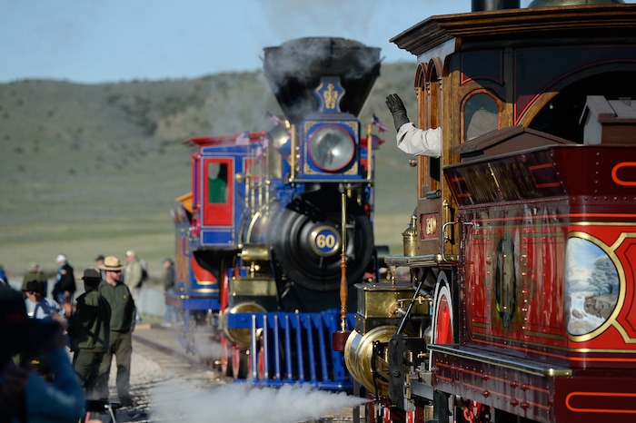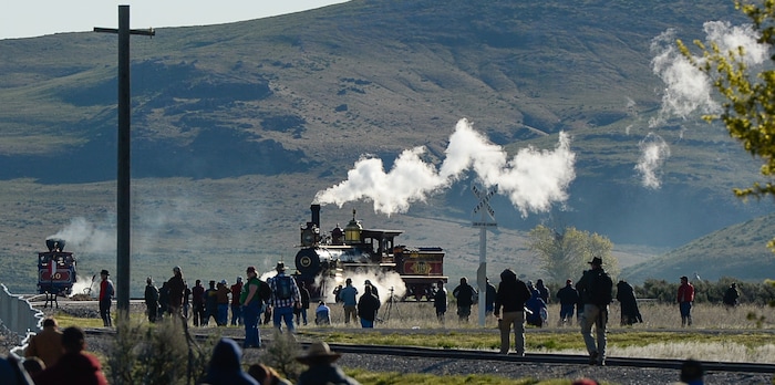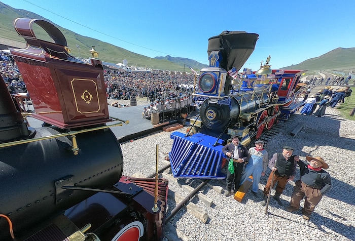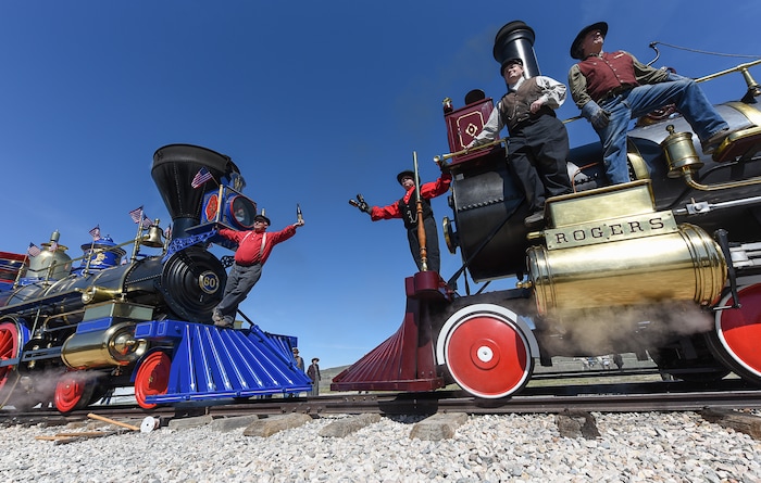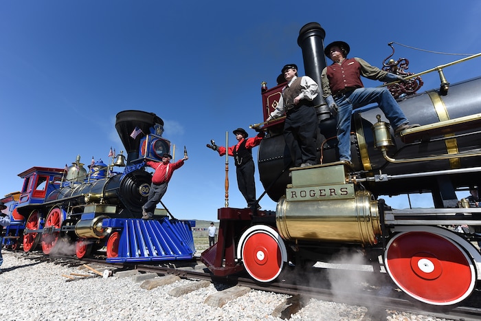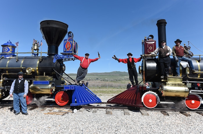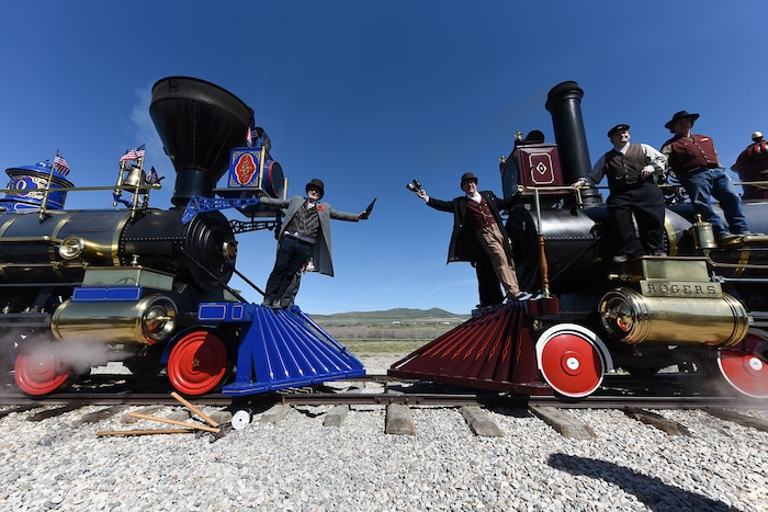 (Francisco Kjolseth | The Salt Lake Tribune) Volunteers who work on the historic trains Jupiter and No. 119 re-create a historic on Friday May 10, 2019, in celebration of the 150th anniversary of the completion of the transcontinental railroad at Promontory Summit where the two rails met back on May 10, 1869.