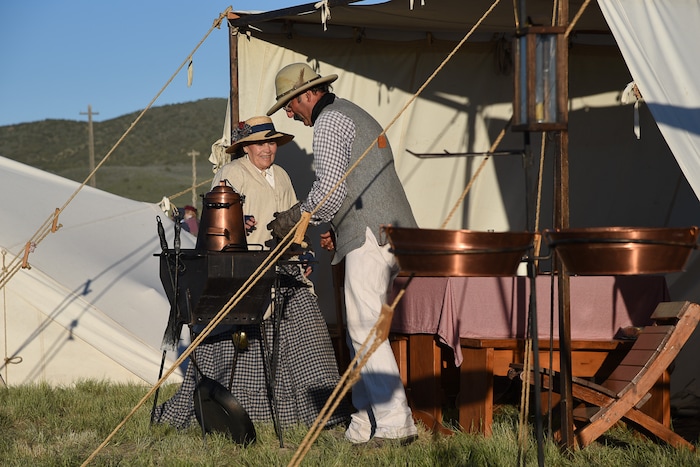 (Francisco Kjolseth | The Salt Lake Tribune) Kirby Brown and his wife Kristen of Park City look the part as they join the festivities on Friday May 10, 2019, in celebration of the 150th anniversary of the completion of the transcontinental railroad at Promontory Summit where the two rails met back on May 10, 1869.