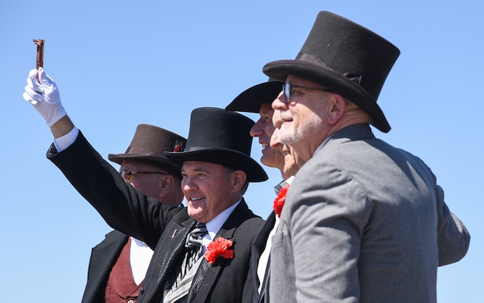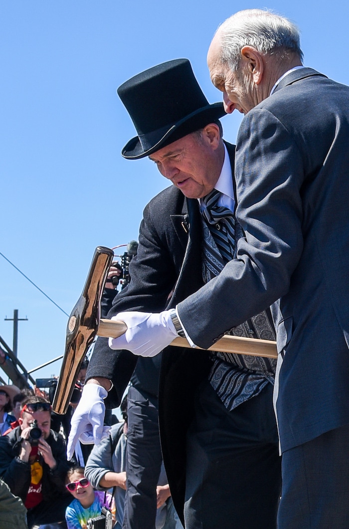 (Francisco Kjolseth | The Salt Lake Tribune) Governor Gary Herbert directs Russell M. Nelson, President of The Church of Jesus Christ of Latter-day Saints in a symbolic strike of a final spike on Friday May 10, 2019, in celebration of the 150th anniversary of the completion of the transcontinental railroad at Promontory Summit where the two rails met back on May 10, 1869.