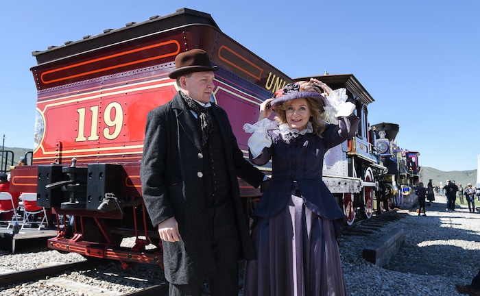 (Francisco Kjolseth | The Salt Lake Tribune) Susy Epherson and Mike Rudoff join in the fun with period clothing on Friday May 10, 2019, in celebration of the 150th anniversary of the completion of the transcontinental railroad at Promontory Summit where the two rails met back on May 10, 1869.