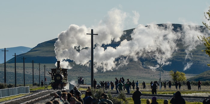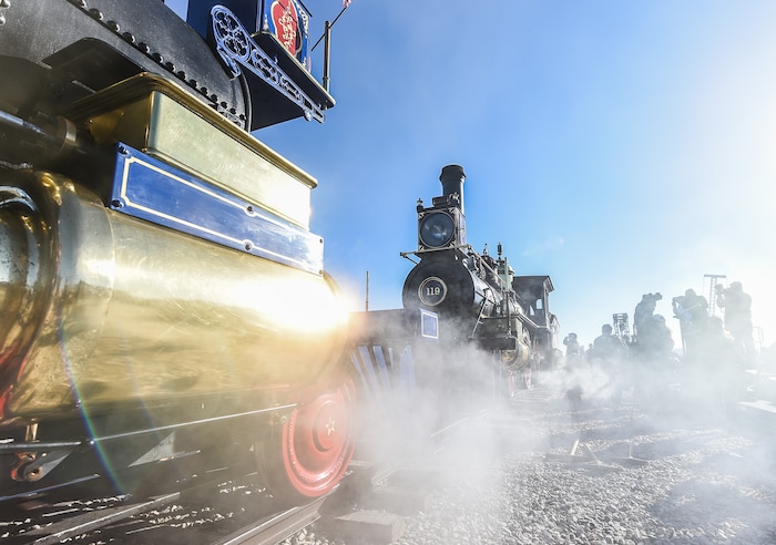 (Francisco Kjolseth | The Salt Lake Tribune) The Jupiter and No. 119 arrive on Friday May 10, 2019, for the celebration of the 150th anniversary of the completion of the transcontinental railroad at Promontory Summit where the two rails met back on May 10, 1869.