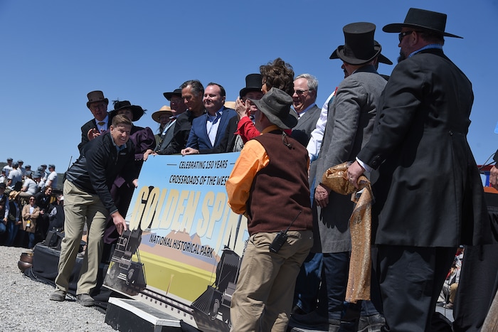 Friday’s ceremony kicked off a weekend of events at Golden Spike National Historic Park. (Bishop unveiled the new signs with the new designation, signed into law in March.)