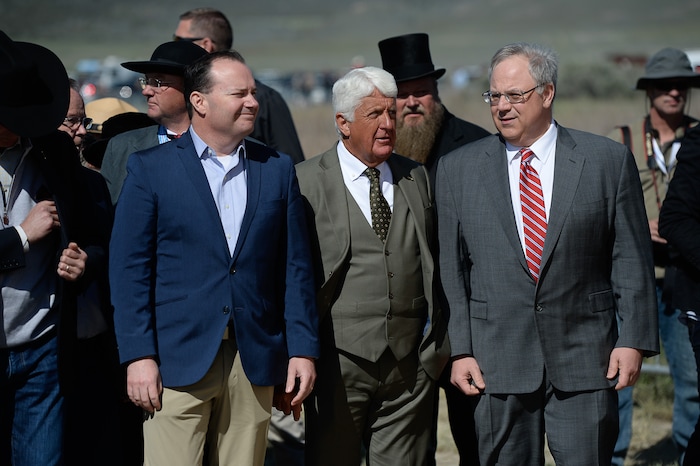 (Francisco Kjolseth | The Salt Lake Tribune) Utah Senator Mike Lee, Congressman Rob Bishop and U.S. Secretary of the Interior David Bernhardt, from left, attend the festivities in celebration of the 150th anniversary of the completion of the transcontinental railroad at Promontory Summit where the two rails met back on May 10, 1869.