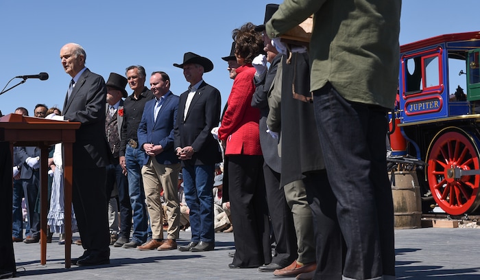 (Francisco Kjolseth | The Salt Lake Tribune) Dignitaries gather for a photo on Friday May 10, 2019, in celebration of the 150th anniversary of the completion of the transcontinental railroad at Promontory Summit where the two rails met back on May 10, 1869.