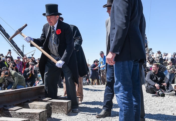 (Francisco Kjolseth | The Salt Lake Tribune) Utah Governor Gary Herbert delivers one of the symbolic strikes on Friday May 10, 2019, in celebration of the 150th anniversary of the completion of the transcontinental railroad at Promontory Summit where the two rails met back on May 10, 1869.