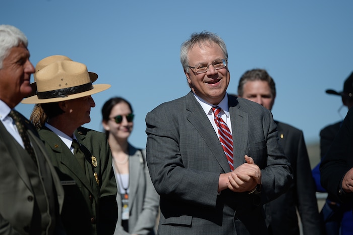(Francisco Kjolseth | The Salt Lake Tribune) U.S. Secretary of the Interior David Bernhardt is welcomed on Friday May 10, 2019, during festivities of the 150th anniversary of the completion of the transcontinental railroad at Promontory Summit where the two rails met back on May 10, 1869.
