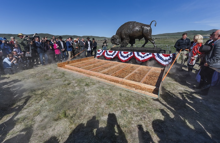 (Francisco Kjolseth | The Salt Lake Tribune) Dust flies as the wall covering the Distant Thunder sculpture is unveiled on Friday May 10, 2019, in celebration of the 150th anniversary of the completion of the transcontinental railroad at Promontory Summit where the two rails met back on May 10, 1869.