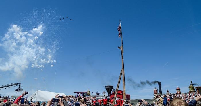 (Francisco Kjolseth | The Salt Lake Tribune) The National Anthem plays, fireworks go off and a fly over is cheered by the crowd on Friday May 10, 2019, in celebration of the 150th anniversary of the completion of the transcontinental railroad at Promontory Summit where the two rails met back on May 10, 1869.