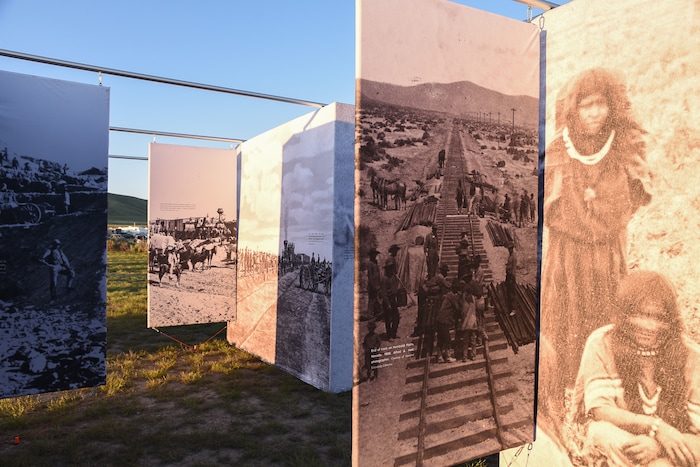 (Francisco Kjolseth | The Salt Lake Tribune) The new Golden Spike sign is unveiled on Friday May 10, 2019, in celebration of the 150th anniversary of the completion of the transcontinental railroad at Promontory Summit where the two rails met back on May 10, 1869.