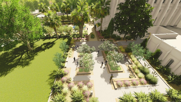 There also will be improvements to the entire temple block, with new walkways, landscaping, water features and trees.