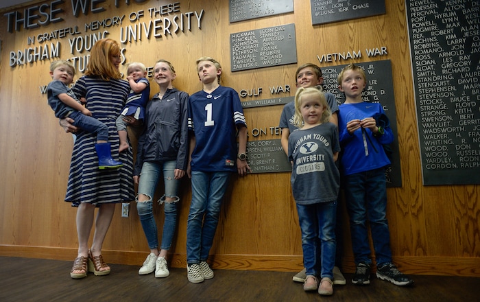 (Francisco Kjolseth | The Salt Lake Tribune) Jennie Taylor is joined by her seven children as they gather for family photographs against the Student Center Reflection Room Memorial Wall as Brigham Young University honors the life and legacy of Major Brent Taylor who was killed in Afghanistan in 2018. The former mayor of North Ogden and a BYU Army ROTC alumnus was honored by the BYU Army ROTC who added his name to the list of 211 who have died in service.