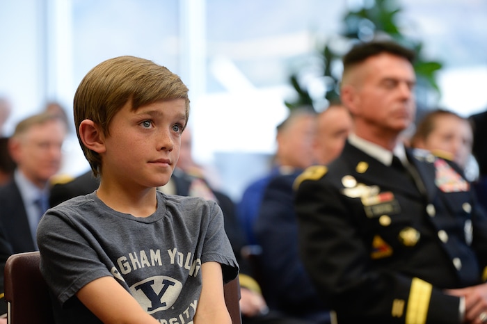 (Francisco Kjolseth | The Salt Lake Tribune) Alex Taylor, 9, attends a special service for his late father Major Brent Taylor as Brigham Young University honors the life and legacy of the former mayor of North Ogden and a BYU Army ROTC alumnus during a ceremony at the Ernest L. Wilkinson Student Center in Provo on Thursday, May 23, 2019. The BYU Army ROTC unveiled the updated Memorial Wall, a list containing 211 BYU students and alumni who have in service which will now include Major TaylorÕs name.