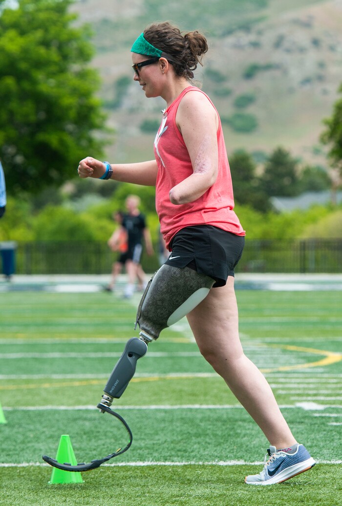 (Rick Egan | The Salt Lake Tribune) Kaylene Baker, Helena, Mt, runs through an obstacle course, during the fourth annual Utah Adaptive Mobility Clinic at Skyline High school. The clinic allows anyone with "lower extremity limb loss or limb difference" or amputees without legs, to practice walking and running. Saturday, June 1, 2019.