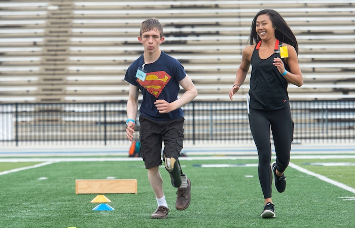 (Rick Egan | The Salt Lake Tribune) Luke Pratt, from Cove Fort, runs with Teagan Young, a physical therapy student at the University of Utah, during the fourth annual Utah Adaptive Mobility Clinic at Skyline High school. The clinic allows anyone with "lower extremity limb loss or limb difference" or amputees without legs, to practice walking and running. Saturday, June 1, 2019.