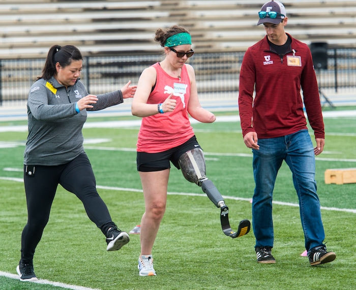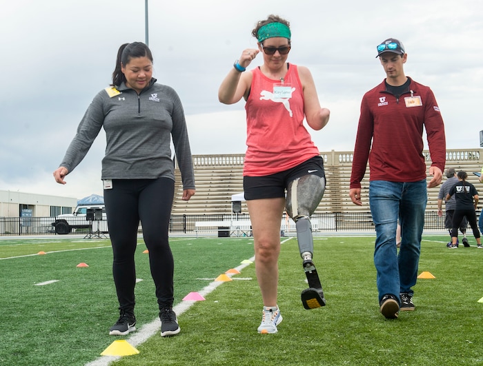 (Rick Egan | The Salt Lake Tribune) Grace Ku helps Kaylene Baker, Helena, Mt, along with Will Cook, during the fourth annual Utah Adaptive Mobility Clinic at Skyline High school. The clinic allows anyone with "lower extremity limb loss or limb difference" or amputees without legs, to practice walking and running. Saturday, June 1, 2019.