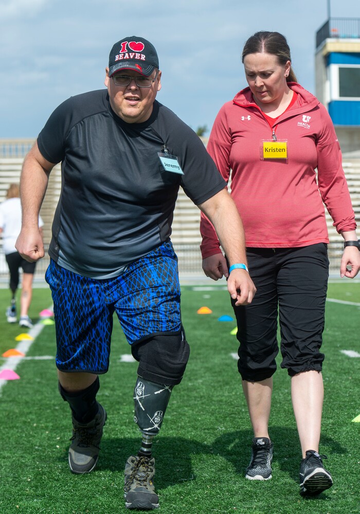 (Rick Egan | The Salt Lake Tribune) Kristen Black-Bain assists Jeremy Wayman, from Kearns, during the fourth annual Utah Adaptive Mobility Clinic at Skyline High school. The clinic allows anyone with "lower extremity limb loss or limb difference" or amputees without legs, to practice walking and running. Saturday, June 1, 2019.