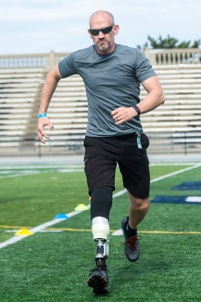 (Rick Egan | The Salt Lake Tribune) Shane Nye, from Ogden, practices running, during the fourth annual Utah Adaptive Mobility Clinic at Skyline High school. The clinic allows anyone with "lower extremity limb loss or limb difference" or amputees without legs, to practice walking and running. Saturday, June 1, 2019.