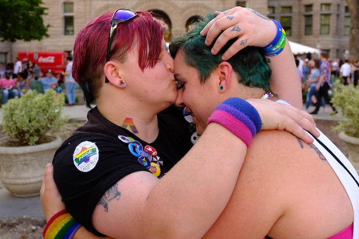Scha Strasburg and Karrah Watson embracing after getting engaged at the Utah Pride Festival in Salt Lake City on Saturday June 1, 2019.