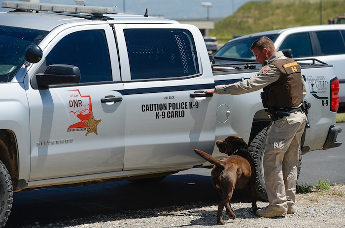 Carlo is one of three officers in the Utah DWR’s newly revitalized K-9 program. The DWR had a K-9 program decades ago, but it was discontinued in the 1990s. A new dog, Cody, joined the force as Carver’s partner in 2016, but that dog succumbed to cancer last year.
