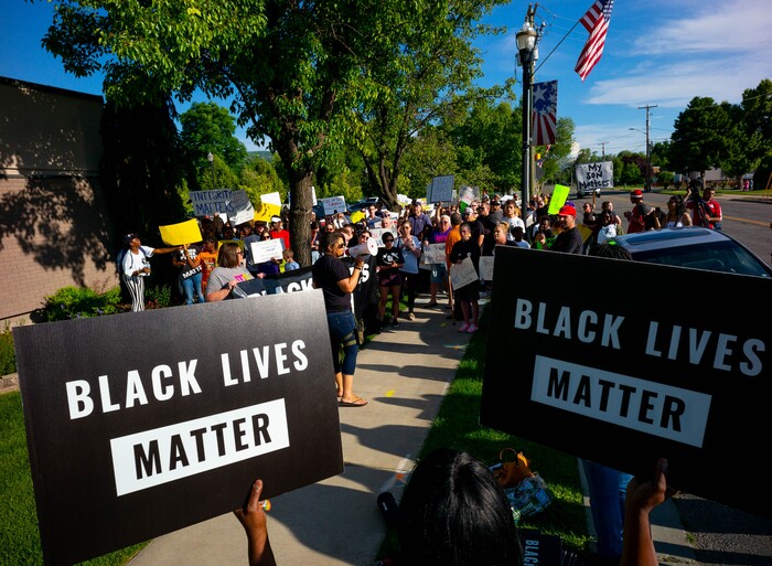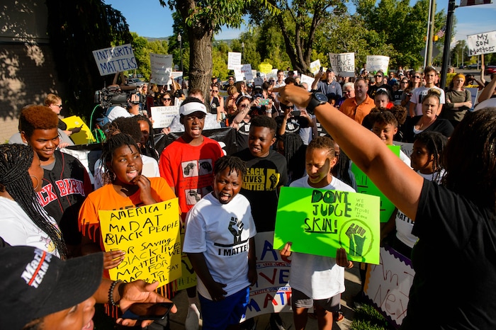 Woods Cross • More than a dozen black children made their way out from between demonstrators to stand front and center at the protest outside the Woods Cross police station. They carried signs asking, in one way or another, “Am I next?” Some wore shirts that said, “I matter.”