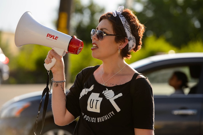 When she arrived at the demonstration Friday, she yelled at the department through a megaphone, "We came here for police accountability and transparency. We came here to let you know you will no longer point your gun in the face of black children in Utah.”