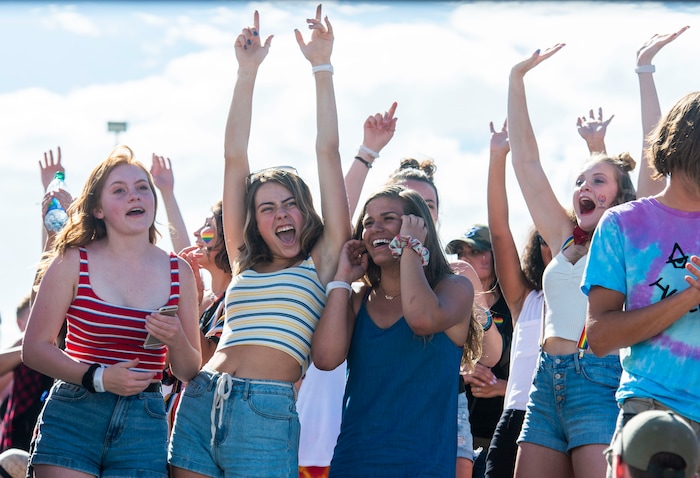 Jacob Berkowitz, Skylar Schlueter and Steven Parsons sing along with Dāya, as she performs at the LoveLoud Festival at the USANA Amphitheater, Saturday, June 29, 2019.