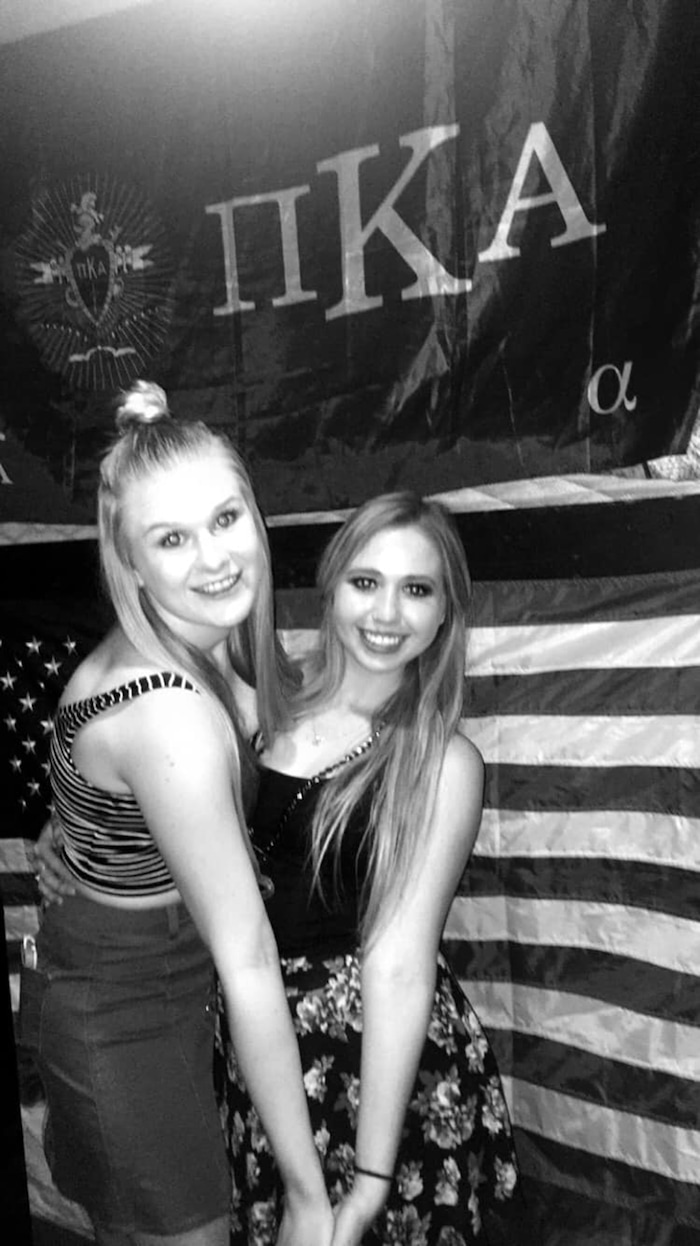 (Photo courtesy of Kennedy Stoner) Mackenzie Lueck, left, and Kennedy Stoner pose beneath the flag of the Pi Kappa Alpha fraternity in this undated photo. Lueck and Kennedy were in the Alpha Chi Omega sorority at the University of Utah.