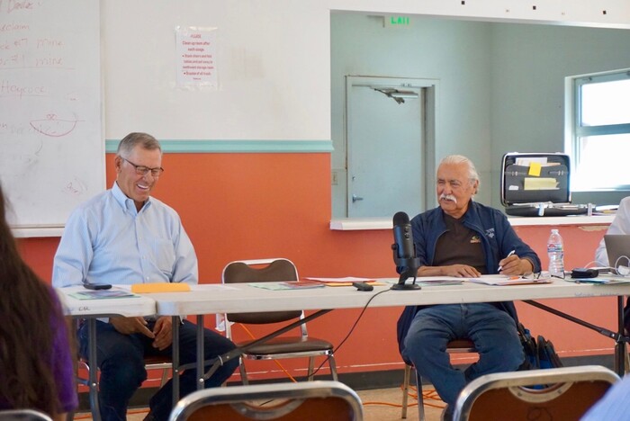 Maryboy welcomed the attendees to the Navajo Nation near the beginning of the meeting, with folks filing in over its three-hour length until approximately 70 people sat in metal chairs or stood shoulder-to-shoulder against the walls. Volunteers passed out trays of coffee in styrofoam cups while the smell of cooking fry bread drifted through the audience.