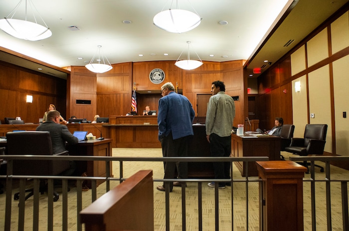 Then it’s back to Courtroom 3C, where he has fewer public defender clients than he had that morning. He’s not there for long. After representing a handful of people, he has to break away to help a paying client in justice court who is insisting that his seven charges be taken to trial.