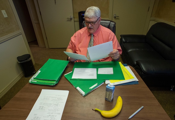 (Rick Egan | The Salt Lake Tribune) Washington County public defender Ed Flint looks through folders containing the cases he will argue that morning, as he prepares for his day in the courtroom, Wednesday, July 10, 2019.