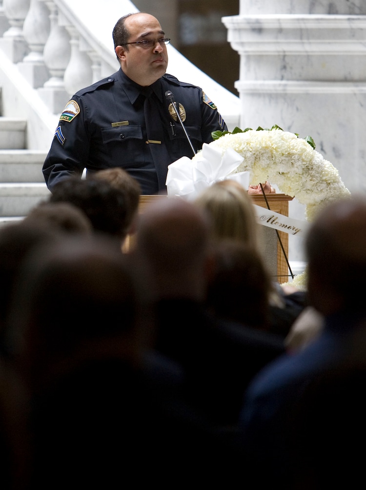 | Tribune file photo In this May 8, 2008, file photo, Aaron D. Rosen, of the Saratoga Springs Police Department, talks about officers losing their lives in the line of duty during the State of Utah Fallen Peace Officers' Memorial Service.