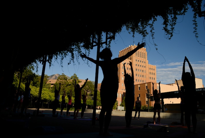 Dozens of yoga enthusiasts filled the Ogden Amphitheater on Thursday during the annual free yoga class sponsored by the Front Yoga Loft and The Front Climbing Club. Nine instructors from the Front Yoga Loft led the crowd as the music of Julian Alvarez played in the background.