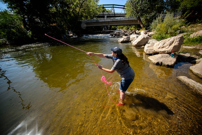 (Trent Nelson | The Salt Lake Tribune) Renee Van Tussenbrook tosses a magnet into the Weber River on Saturday, Aug. 31, 2019. Volunteers assisted the Utah Cold Case Coalition, hoping to find evidence in several cases.