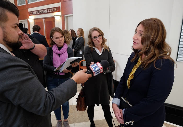 (Francisco Kjolseth | The Salt Lake Tribune) Salt Lake Tribune editor Jennifer Napier-Pearce speaks with the media outside the Utah Supreme Court where it heard the appeal filed by BYU lawyers in 2018 after a 3rd District judge ruled that the private universityÕs police force is a governmental entity that has to follow the same rules for transparency as other police departments across the state on Friday, Oct. 4, 2019. The Salt Lake Tribune's lawsuit involved whether BYU police should be subject to Utah's open records laws.