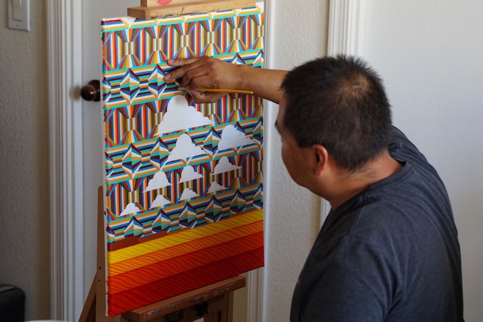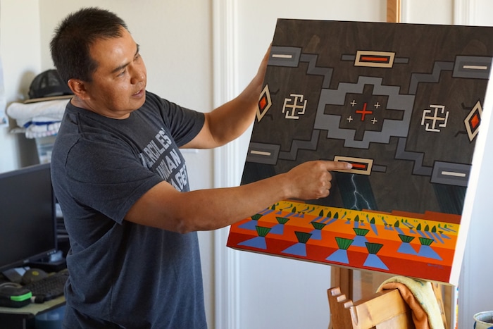 Outside the window, an immense sky hangs over the treeless mesas of the northern Navajo Nation. But Scott is turned toward his canvas, where he is layering vivid colors into an intense, geometric pattern, which he says was inspired by a Diné (Navajo) rug weaving tradition known as Eye Dazzlers.