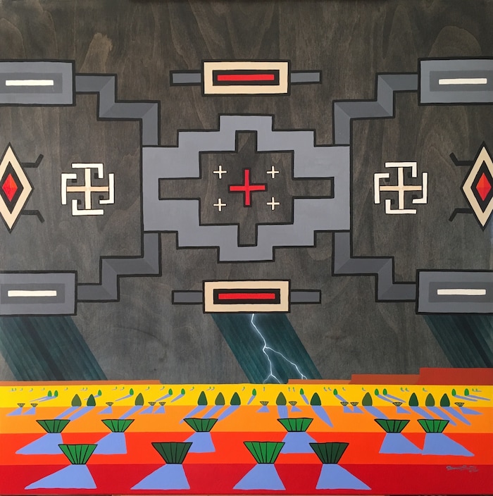 His sky — which indeed resembles rug patterns found in galleries across the Four Corners — takes up three-quarters of the painting. It jumps out at the viewer in a kind of optical illusion, the geometric shapes bulging off the flat canvas between layers of clouds. The outlines of red rock mesas lie below.