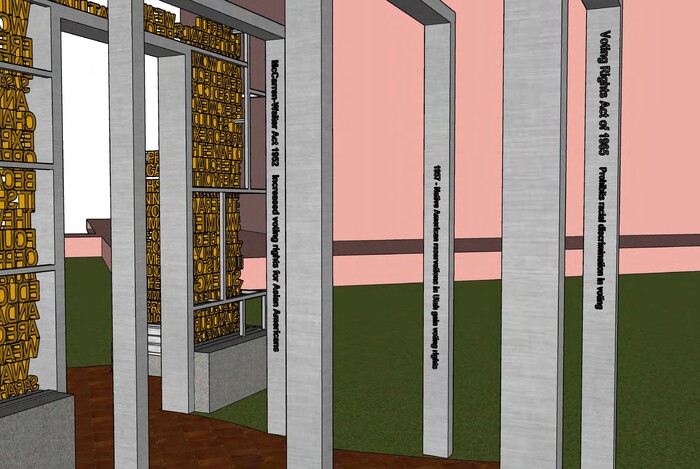 Near the table and chairs will be four engraved door frames, which represent the progression of voting rights achievements in the 20th century. The artists included the ratification of the 19th Amendment in 1920; the Indian Citizenship Act in 1924, which granted citizenship to Native Americans born in the U.S.; the McCarran-Walter Act in 1952, which addressed immigration; and the Voting Rights Act of 1965.