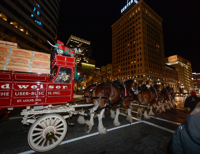(Francisco Kjolseth | The Salt Lake Tribune) Budweiser’s iconic Clydesdales make a special trip to Utah to celebrate the changing beer laws in the state, joined by a “ghoulish group of pallbearers,” on Wed. Oct. 30, 2019, for a funeral procession for Utah’s last remaining 3.2 percent beer, on their way to Bar X, Beer Bar and Johnny’s on 200 South in Salt Lake City, as the state prepares to start selling 5 percent alcohol-by-volume in grocery and convenience stores starting Friday.