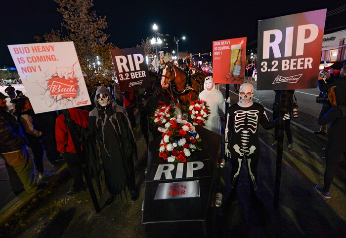 The iconic Budweiser Clydesdales — and a ghoulish group of pallbearers — held a funeral Wednesday evening to ceremoniously bid goodbye to Utah’s last remaining 3.2% beer (4% alcohol by volume).