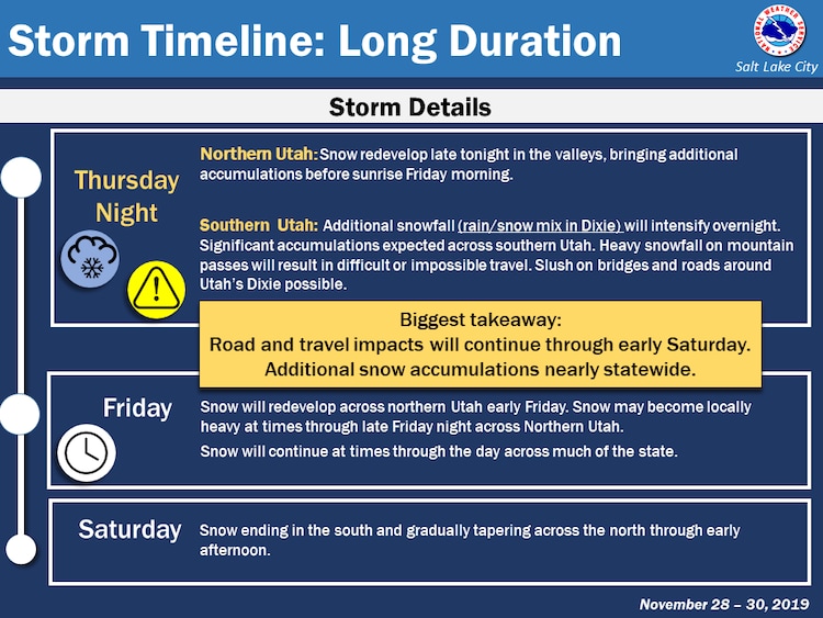 As another storm front moves in, Northern Utah valleys are predicted to receive 3 to 6 more inches, with possibly more on the benches. It will impact travel through Saturday, according to the weather service. Snow will start again Thursday night and into Friday morning. A “deep stream of moisture” is coming from the southwest, the NWS weather report says.