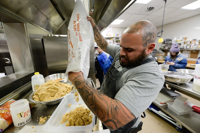 (Francisco Kjolseth | The Salt Lake Tribune) A.J. Collette, head of operations and former intern at Flourish Bakery measures out brown sugar for a large pie order before the Thanksgiving holiday. The bakery needs to find a new home before Christmas. The non-profit bakery teaches those who have been incarcerated or recovering from substance abuse the art of baking. The skills they learn help them get a job and become financially independent. The bakery has been housed at SLCC's South City campus, but the college has said they can no longer use the space.