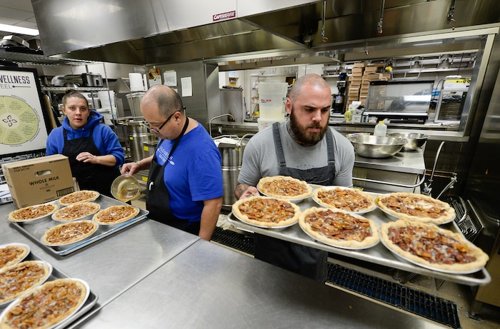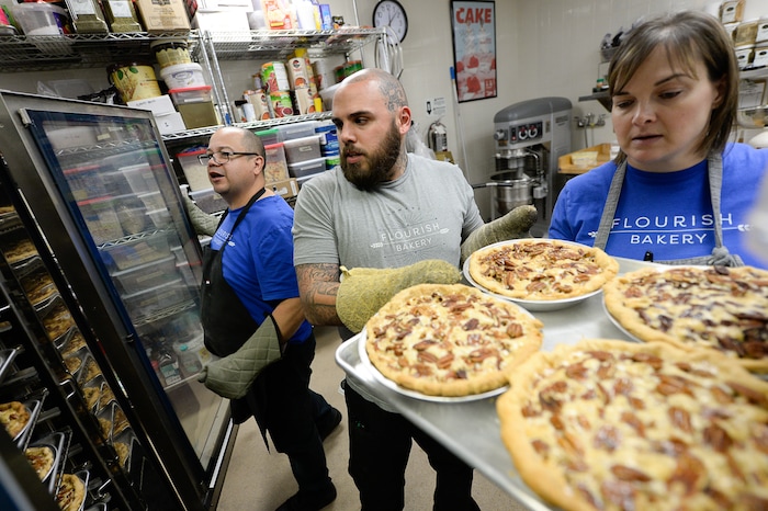 (Francisco Kjolseth | The Salt Lake Tribune) Erica Soucie, Dennis Sisneros and A.J. Collette, from left, prepare pecan pies for the oven at Flourish Bakery before the Thanksgiving holiday as part of their "Pie it Forward" program. Flourish Bakery needs to find a new home before Christmas. The non-profit bakery teaches those who have been incarcerated or recovering from substance abuse the art of baking. The skills they learn help them get a job and become financially independent. The bakery has been housed at SLCC's South City campus, but the college has said they can no longer use the space.