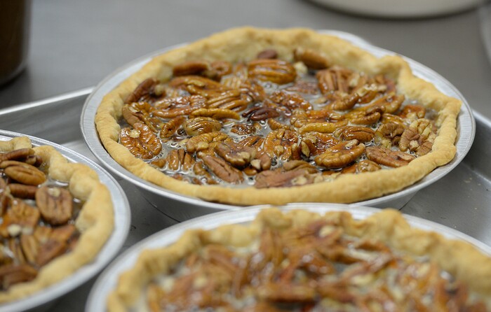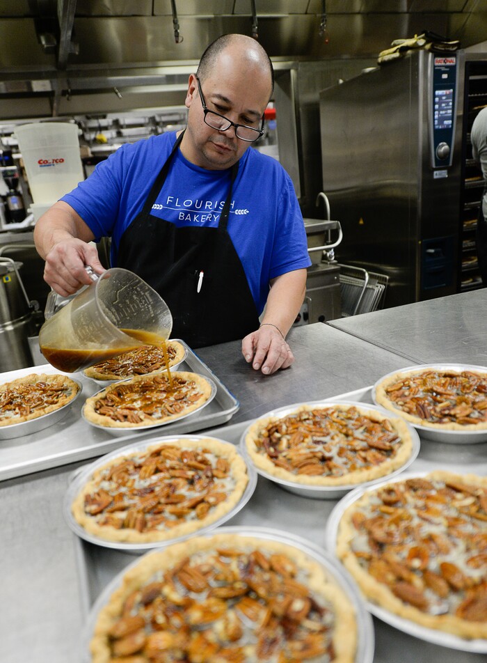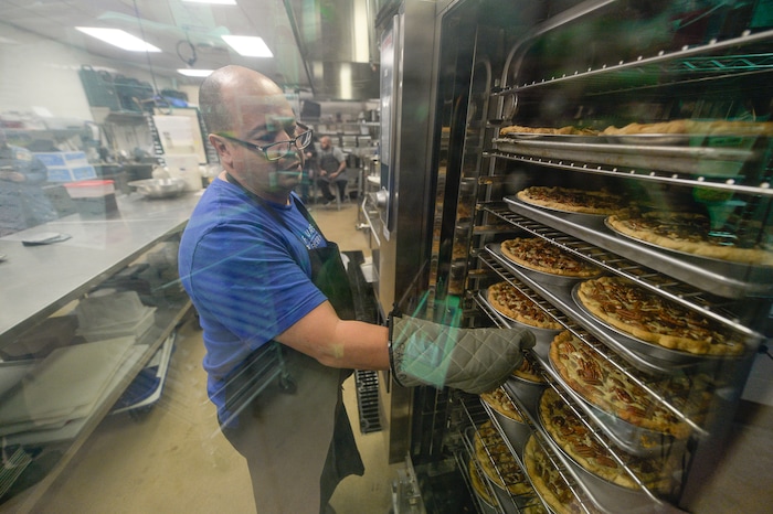 (Francisco Kjolseth | The Salt Lake Tribune) Dennis Sisneros, an intern at Flourish Bakery checks on a large order of pecan pies during a rush to fulfill a large order before the Thanksgiving holiday on Tuesday, Nov. 26, 2019. Flourish Bakery needs to find a new home before Christmas. The non-profit bakery teaches those who have been incarcerated or recovering from substance abuse the art of baking. The skills they learn help them get a job and become financially independent. The bakery has been housed at SLCC's South City campus, but the college has said they can no longer use the space.