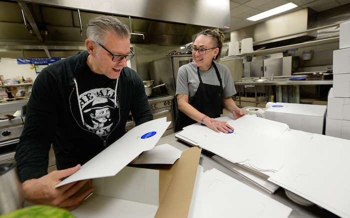 (Francisco Kjolseth | The Salt Lake Tribune) Scott Covington, administrative assistant at Flourish Bakery and intern Tristin Arellano fold pie boxes as they fulfill a large order as part of their "Pie it Forward" program before the Thanksgiving holiday on Tuesday, Nov. 26. Flourish Bakery needs to find a new home before Christmas. The non-profit bakery teaches those who have been incarcerated or recovering from substance abuse the art of baking. The skills they learn help them get a job and become financially independent. The bakery has been housed at SLCC's South City campus, but the college has said they can no longer use the space.