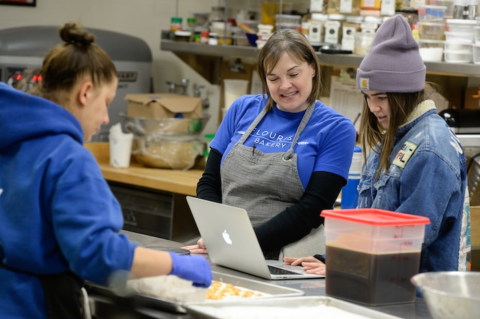 (Francisco Kjolseth | The Salt Lake Tribune) Aimee Altizer, center, Executive Director of Flourish Bakery works with University of Utah communications intern Ally Megill who is helping the bakery run their Instagram and FaceBook accounts. The bakery which has been housed at SLCC's South City campus needs to find a new home before Christmas after the college gave them notice and said they can no longer use the space.