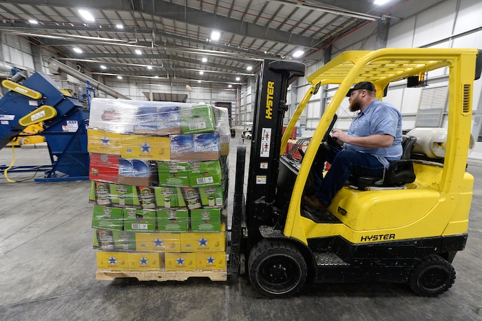 (Francisco Kjolseth | The Salt Lake Tribune) Operator Jayson Dlugas unpackages product as the DABC delivers 275 cases of beer on three pallets to the new food digester in North Salt Lake on Friday, Dec. 13, 2019. The state can no longer sell the beer — all between 4% and 5% ABV — because it can't compete with privately-owned grocery and convenience stores which started selling the higher alcohol brews on Nov. 1.